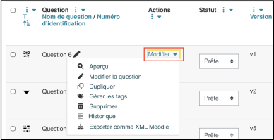 Prévisualiser, modifier, supprimer ou déplacer une questionProcédureOuvrez la « Banque de questions », onglet « Questions ».⚓Dans le menu déroulant « Choisir une catégorie », choisissez la catégorie dans laquelle vous souhaitez travailler.⚓Cliquez sur « Appliquer les filtres » pour afficher les questions correspondant à la catégorie sélectionnée.Cliquez sur « Modifier » pour modifier la question, la prévisualiser, la supprimer.⚓