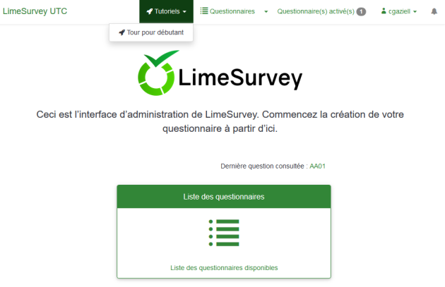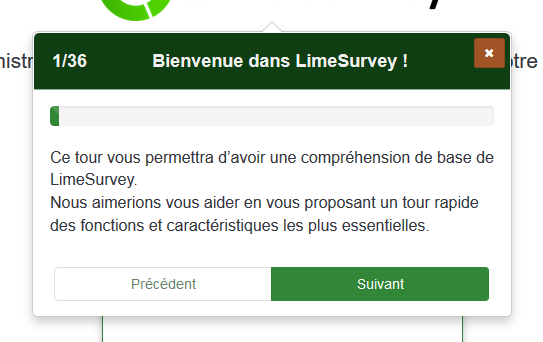 Visite guidéeLime Survey vous propose une visite guidée pour vous guider dans la prise en main de l’outil et réaliser votre premier sondage.⚓Pour cela, cliquez sur « Tutoriels » puis « Tout pour débutant ».Suivez les indications qui s’affichent.