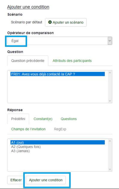 « Fixer les conditions ».Choisissez l’opérateur de comparaison et sélectionnez question et réponse attendues.