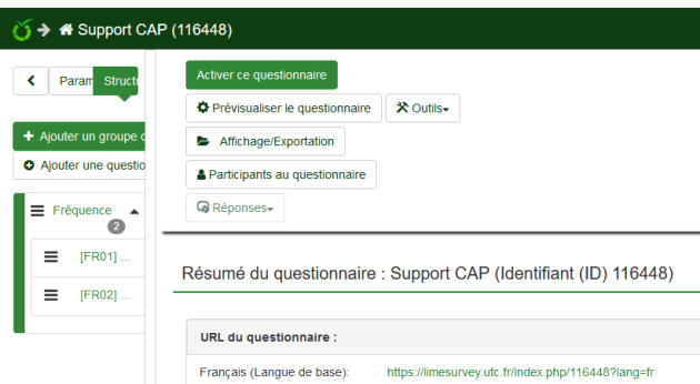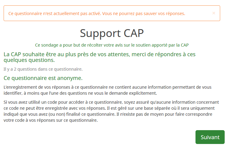 Prévisualiser le questionnaireSur la page d’accueil du questionnaire, cliquez sur « Prévisualiser le questionnaire ».⚓Vous remarquez la phrase « Ce questionnaire n’est actuellement pas activé ».