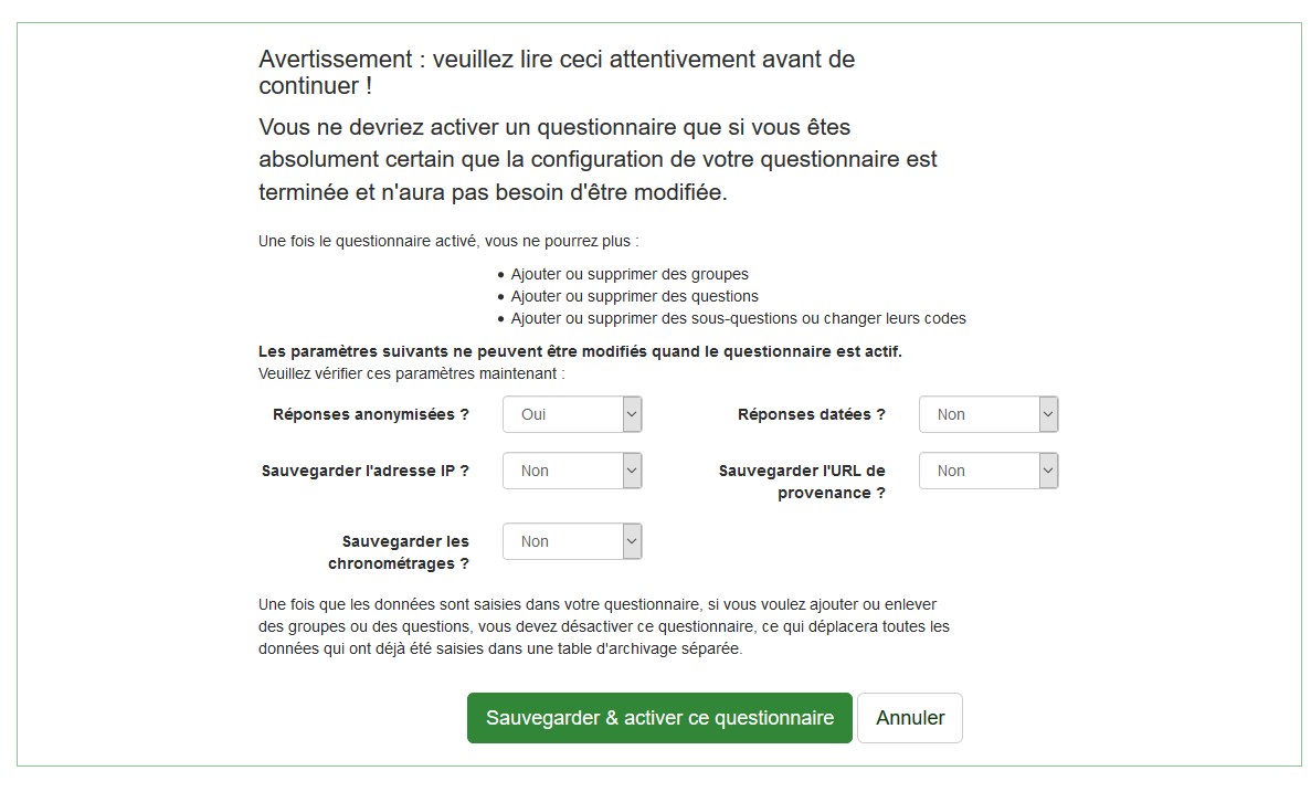 « Activer ce questionnaire ».AttentionVous devez activer le questionnaire une fois toutes les modifications effectuées.⚓