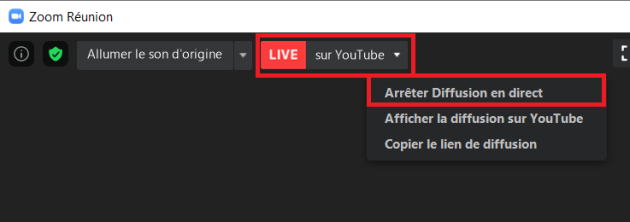 Arrêter la diffusion sur YouTubeOuvrez la fenêtre Zoom et en haut à gauche,cliquez sur « Live sur YouTube »,puis « Arrêter Diffusion en direct ».RemarqueVous pouvez poursuivre la réunion sur Zoom.