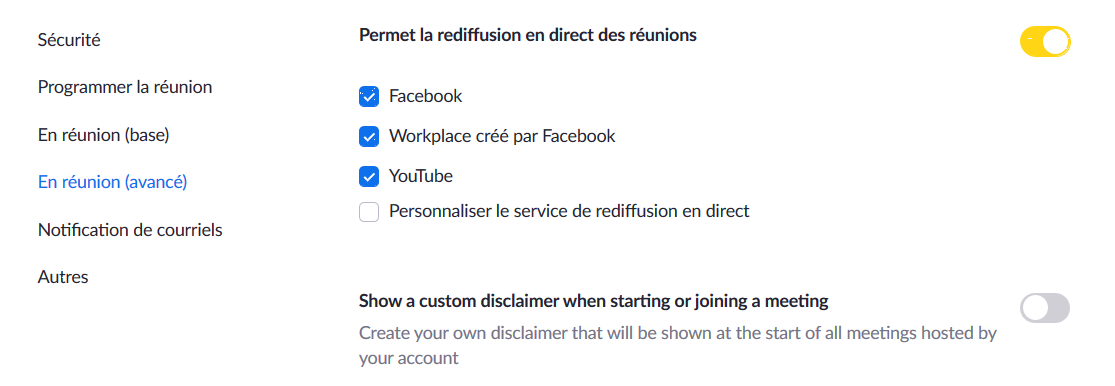 Cliquez ensuite sur « En réunion (avancé) » et vérifiez que « Permet la rediffusion en direct des réunions » et « YouTube » sont activés :