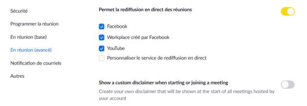 « En réunion (avancé) »et vérifiez que« Permet la rediffusion en direct des réunions »et« YouTube »sont activés :