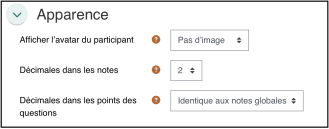 ApparenceLe sous-menu « Apparence » vous permet de déterminer le nombre de décimales accepté dans la note.Conseil : Nous vous conseillons d’accepter 2 décimales pour prendre en compte les demi-points de questions partiellement correctes.