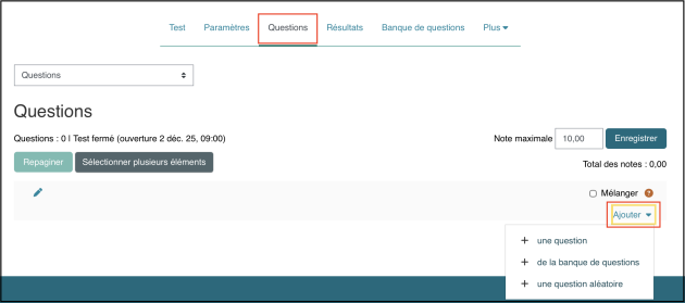 « Questions »de votre test, cliquez sur« Ajouter ». Plusieurs options vous seront alors proposées.⚓