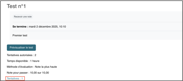 La page d’accueil du test vous permet de voir le nombre de réponses (Tentatives) au test :