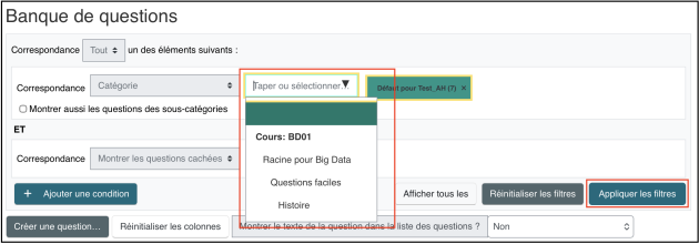 « Banque de questions », onglet« Questions ».⚓« Choisir une catégorie », choisissez la catégorie dans laquelle vous souhaitez travailler.⚓Cliquez sur