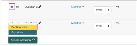 Prévisualiser, modifier, supprimer ou déplacer une questionProcédureOuvrez la « Banque de questions », onglet « Questions ».⚓Dans le menu déroulant « Choisir une catégorie », choisissez la catégorie dans laquelle vous souhaitez travailler.⚓Cliquez sur « Appliquer les filtres » pour afficher les questions correspondant à la catégorie sélectionnée.Cliquez sur « Modifier » pour modifier la question, la prévisualiser, la supprimer.⚓