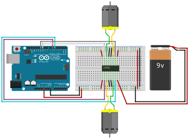 Le programme ci-dessous permet de contrôler deux moteurs à courant continu avec un contrôleur L293D :