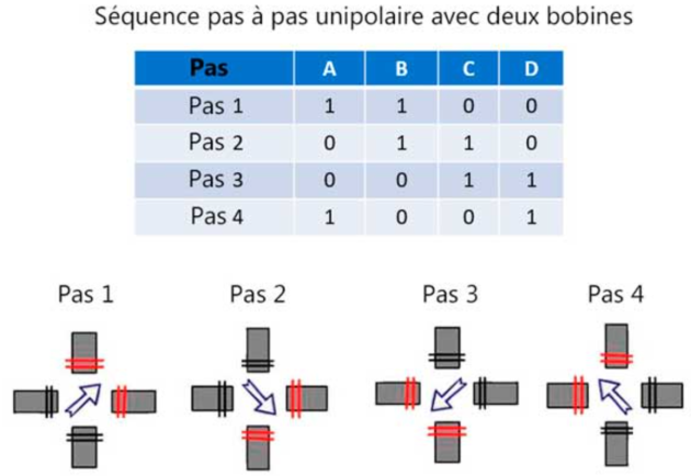 Dans ce cas, les bobines sont pilotées ainsi :
