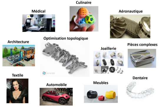Le secteur de l'impression 3D touche un large éventail de filières, telles que la mode, le monde culinaire, le médical, l'architecture, l'ameublement, l'automobile, l'aéronautique, la joaillerie, etc.