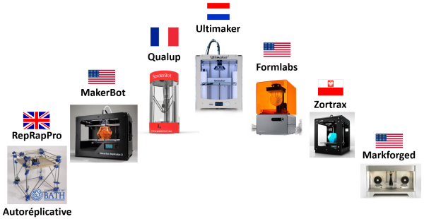 Les acteurs des imprimantes 3D sont très majoritairement des entreprises américaines. On peut facilement citer Stratasys et 3DSystems qui ont de très grandes parts de marché pour - respectivement - le dépôt de matière (FDM) et la stéréographie (SLA).