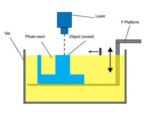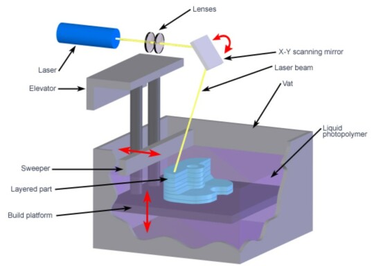 Ce procédé durcit la résine liquide située en surface du bain par le biais d'un laser de grande précision qui balaie la surface en suivant un parcours qui couvre entièrement la surface correspondant à la strate de pièce à produire. Le plateau sur lequel repose la pièce produite descend progressivement au fur et à mesure que les couches sont solidifiées.