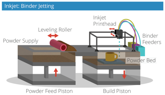 La projection de liant (ou Binder Jetting) est une technique qui utilise la projection d'un liant sur un bain de poudre pour l'agglomérer et former les couches de la pièce. Une fois une couche durcie, le plateau descend d'une hauteur de couche, un chariot vient déposer une nouvelle couche de poudre non agglomérée sur la précédente, du liant est à nouveau projeté et ainsi de suite jusqu'à obtention de la pièce finale.
