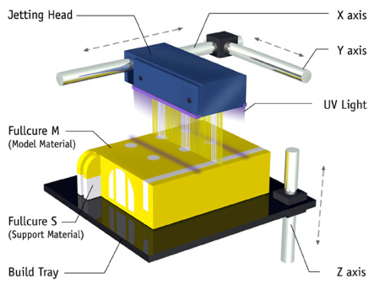Dans ce procédé, des goutelettes de matériau sont projetées sur le plateau d'impression selon un motif qui correspond à la tranche de la pièce réalisée. Après chaque jet, le polymère est solidifié grâce à une lumière UV. Les goutellettes étant liquides, un autre matériau liquide durcissant rapidement en refroidissant est égalemet projeté autour du motif que forme la résine photodurcissable pour la contenir le temps qu'elle durcisse (ce qui peut prendre un temps important). Cet autre matériau sert aussi de support pour les géométries en porte à faux. Ce matériau peut ensuite être fondu dans un four à 70° ou dissou dans de l'eau selon sa nature, pour être évacué et libérer la pièce produite en résine photodurcissable.