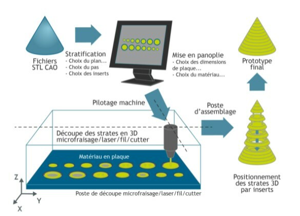 La découpe du modèle 3D est réalisée en fonction de l'épaisseur des feuilles ou plaques découpées. La machine découpe la matière au moyen d'un laser ou d'une microfraisage ou d'un fil ou encore d'un cutter. Les couches sont empilées et liées les unes aux autres au fur et à mesure de la découpe.
