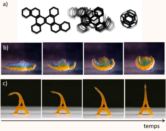 - élastomères à cristaux liquides (LCE en anglais) qui, comme leur nom l’indique, contiennent des cristaux liquides sensibles à la chaleur. En contrôlant leur orientation, on peut programmer la forme souhaitée,